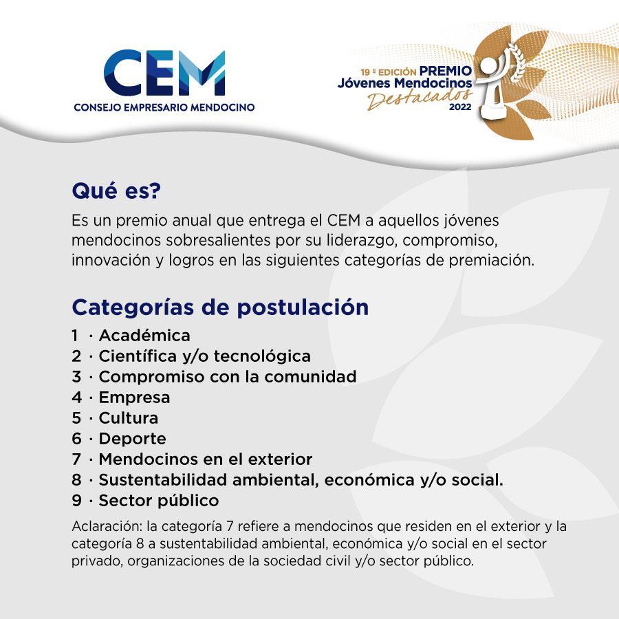 • El CEM prorroga hasta el 20 de septiembre la inscripción para el Premio Jóvenes Mendocinos Destacados 2022